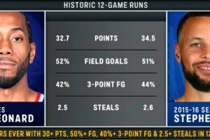 史上仅有的两位 在连续12场比赛中场均至少30分2.5断 命中率50%&三分命中率40%球员