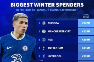体育资讯1月15日讯 《转会市场》统计了截止今年1月15日以来的冬窗历史转会总支出情况,切尔西力压曼城居首,前十英超占据8席。
