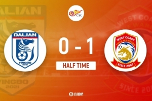 伤停补时4分钟。上半场比赛结束,大连英博0-1青岛西海岸。