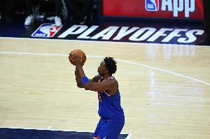 尼克斯球员阿努诺比上半场是球队表现最不错的球员,他多次切入内线完成扣篮,防守也很给力,还有协防大帽英格拉姆的精彩表现。