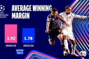 联赛阶段还带来了更小的胜利差距,平均胜利差距为1.78个进球,低于上赛季的1.92个进球。比赛更加接近、更具竞争力和戏剧性。