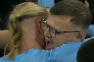 曼城官方社媒晒出视频,哈兰德赛后将球衣赠送给一名球迷,后者与哈兰德拥抱,并亲吻了他的脸颊。