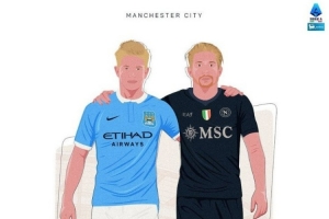 意甲官推也晒出海报为本场比赛预热,海报中是分别身披曼城球衣以及那不勒斯球衣的德布劳内,配文写道:“过去和现在!”