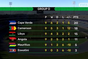 世预赛仅剩最后一轮,佛得角仍2分领跑,下轮面对小组垫底的斯威士兰,赢球即可确保队史首次晋级世界杯;喀麦隆第2落后2分,但握有7个净胜球优势。