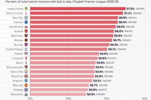 体育资讯10月10日讯 OPTA统计了本赛季至今英超20队净比赛时间占据总比赛时间的比率,利兹联居首,纽卡、切尔西、曼联倒数前三。