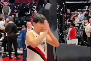 赛后,开拓者主场球迷们呼喊杨瀚森的名字予以支持,杨瀚森双手合十表示感谢。