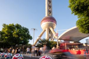近日,2026年FIFA世界杯官方比赛用球“三重浪”来到上海东方明珠广播电视塔,开启限时亮相活动。