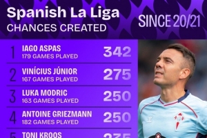 体育资讯10月12日讯 Squawka统计了20-21赛季以来球员在西甲创造机会的次数,并列出榜单,阿斯帕斯342次居首,维尼修斯275次第二。