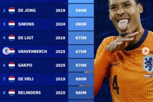 荷兰球员历史身价榜:范迪克1亿欧居首,弗兰基-德容9000万欧次之