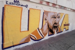 这幅壁画是以东契奇的名字“LUKA”为背景,在字母的基础上绘制了东契奇怒吼的画像。