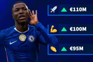 凯塞多目前身价为9000万欧,此次更新最高将涨至1.1亿欧,成为英超第10位亿元先生,最低将下跌至8500万欧。