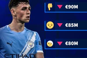 体育资讯10月16日讯 明日德转将更新英超球员身价,德转官方社媒今日发图预热福登身价变化,球员身价必定下跌,最多跌至7500万。