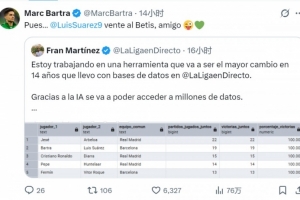 目前效力于贝蒂斯的巴尔特拉在社交媒体上转发了这条动态,配文调侃:“那么…苏亚雷斯,来贝蒂斯吧,哥们。”