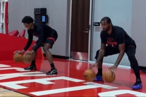 体育资讯10月19日讯 火箭官方社媒更新,分享阿门-汤普森与塔里-伊森一同进行运球训练的视频。