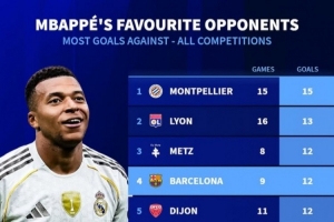 姆巴佩生涯各项赛事进球最多球队: