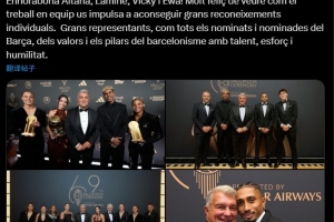 拉波尔塔在个人社媒写道:祝贺艾塔娜、拉明、维姬和艾娃,很高兴看到你们凭借团队合作获得如此大的个人认可,和所有巴萨提名球员一样,你们用才华、努力和谦逊,出色地体现了巴萨精神的价值观。