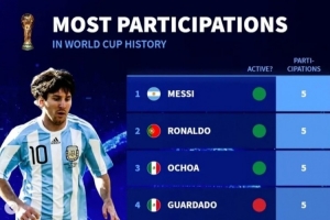1.梅西 (阿根廷), 5届 (2006, 2010, 2014, 2018, 2022)