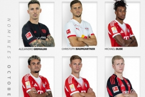 体育资讯10月29日讯 今日,德甲官方公布了10月份联赛最佳球员的6名候选人,奥利塞领衔拜仁3将在列。