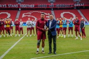 今天的官方训练开始前,俱乐部为两位球员举行颁奖仪式。俱乐部总经理沙良昌为莱昂纳多颁发第25轮最佳球员奖杯,为李帅赠送百场纪念球衣。