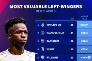 左边锋德转身价排行:维尼修斯1.5亿欧居首,K7、拉菲9000万欧