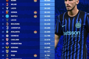 2025-26意甲俱乐部季票销售排名:国米、罗马4万张并列第一