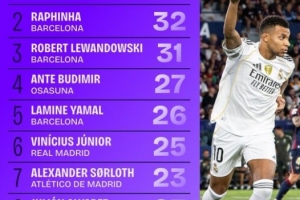 上赛季以来西甲直接参与进球数排行:姆巴佩42球居首大幅领先