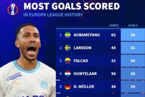 体育资讯9月25日讯 德国转会市场盘点了欧联杯球员历史进球排名,奥巴梅扬34球居首。