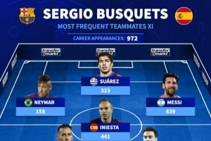 德转评布斯克茨最常搭档11人阵容​:梅西639场第1,皮克605场第2