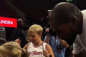 GIF-杜兰特赛前为小球迷签名