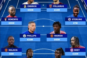 前锋:塞梅尼奥(伯恩茅斯)5500万欧、恩德里克(皇马)3500万欧、菲尔克鲁格(西汉姆联)1000万欧、斯特林(切尔西)700万欧