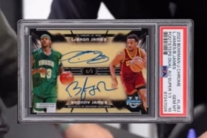 体育资讯11月25日讯 球星卡Topps社媒更新动态,晒出了詹姆斯第一次签了自己和布朗尼的双签名卡时的视频。