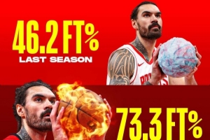 亚当斯上赛季罚球命中率46.2%,本赛季73.3%,进步幅度58.66%(46.2%×58.66%+46.2%=73.3%);生涯罚球命中率为53.3%