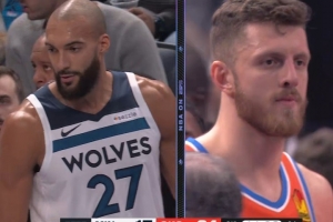 (双方拼抢时戈贝尔击中哈滕面部,裁判先吹戈贝尔犯规,回看后追加技犯,森林狼挑战成功改吹哈滕犯规,但戈贝尔技犯保留)