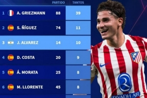 体育资讯11月27日讯 在本轮欧冠马竞2-1击败国米的比赛中,阿尔瓦雷斯破门,打进马竞生涯欧冠第10球。以下为马竞队史欧冠进球榜: