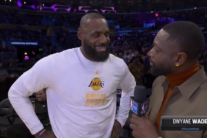 体育资讯11月29日讯 今日,湖人在NBA杯赛中129-119主场击败独行侠。赛前,湖人前锋詹姆斯接受了NBA名宿韦德的采访。