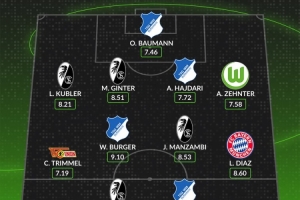 中场:克里斯托弗·特里梅尔(柏林联,7.19分)、沃特·伯格(霍芬海姆,9.10分)、约翰·曼赞比(弗赖堡,8.53分)、路易斯·迪亚斯(拜仁,8.60分)