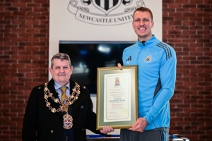 本周,布莱斯市市长戴维·斯温霍议员前往纽卡斯尔联队训练基地,为丹·伯恩颁发了这项殊荣——布莱斯市最高公民奖——以表彰他在联赛杯决赛中为纽卡斯尔联做出的卓越贡献。