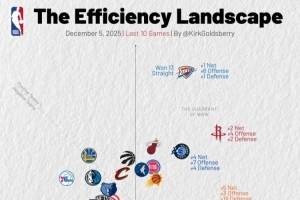 横轴代表进攻效率,越靠右越好,纵轴代表防守效率,越靠上越强。第一象限的球队多为发挥出色的球队,而在第三象限的球队通常为战绩比较糟糕的球队。
