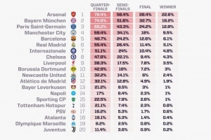 体育资讯12月9日讯 本赛季欧冠联赛阶段第6轮的比赛即将开打,opta在当地时间12月9日对本赛季欧冠的形势进行了新一轮预测,阿森纳夺冠概率22.6%最高,拜仁、巴黎排在二三位。