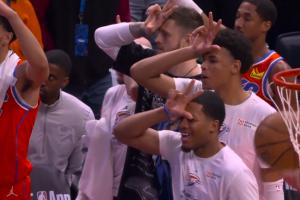 替补席全员必出杰伦威庆祝动作,半场雷霆三分19中13!