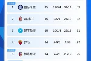 目前积分榜上,国米33分领跑,米兰32分第二,那不勒斯31分第三。