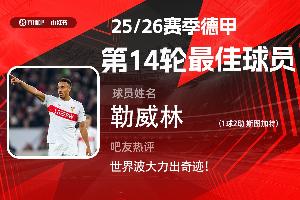 第14轮评选结果出炉,斯图加特球员勒威林独造三球,并轰出无解世界波,助球队大胜不莱梅,获得吧友超1万票支持,当选【体育资讯X小红书德甲第14轮最佳球员】!