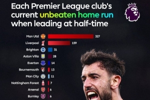 据英超官方统计,曼联延续着联赛主场半场领先全场不败的纪录,场次达到327场。