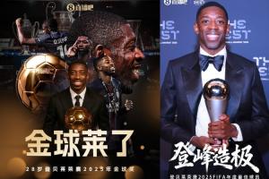体育资讯12月17日讯 登贝莱荣膺2025FIFA年度最佳球员,包揽2025金球奖和2025FIFA最佳两项大奖。