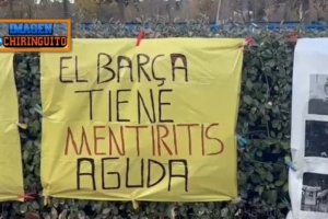 对于拉波尔塔的言论,皇马球迷显然有着不同的意见。在俱乐部训练基地外,皇马球迷打出了巴萨“撒谎成性”的横幅。
