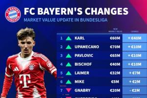 拜仁球员身价变化:卡尔上涨4000万欧,凯恩和穆西亚拉降1000万欧