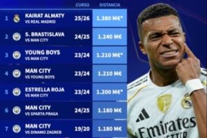 体育资讯9月30日讯 欧冠联赛阶段第2轮,皇马将做客对阵阿拉木图凯拉特。“转会市场网”统计了欧冠单场对决双方身价差距最悬殊的10场比赛,除皇马对阵阿拉木图凯拉特的比赛排名第一之外,该榜单上其余9组对决全部由曼城及其对手创造。