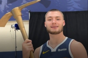 体育资讯9月30日讯 掘金官方分享新赛季定妆照拍摄花絮,布劳恩手持铁镐出镜。