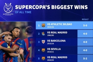 西超杯历史最大比分胜利榜:巴萨5-0毕巴居首,前10巴萨占5席