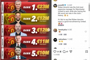 体育资讯1月9日讯 score90的社媒账号,给出曼联过去几年解雇主帅的花费排行,其中穆里尼奥以2300万欧列第一。